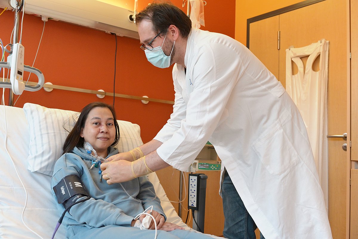 Als eines von nur wenigen universitären Zentren in Deutschland verfügt die Medizinische Klinik 5 – Hämatologie und Internistische Onkologie des Uniklinikums Erlangen über die Erlaubnis, CAR-T-Zellen herzustellen. Diese zellbasierte Immuntherapie kommt bisher vor allem bei bestimmten Arten von Blut- und Lymphdrüsenkrebs zum Einsatz. Seit einigen Jahren wenden Ärztinnen und Ärzte sie aber auch im Rahmen von klinischen Studien bei soliden Tumoren wie Brust-, Hoden- oder Eierstockkrebs und bei schweren Autoimmunerkrankungen an. Jetzt hat Maulia F. aus München, die an einer entzündlichen Muskelerkrankung mit Haut- und Lungenbeteiligung leidet, die 100. CAR-T-Zell-Infusion aus Erlanger Eigenherstellung erhalten.