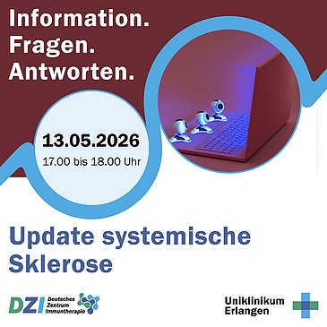 Sie zählt zu den seltenen, aber schweren Autoimmunerkrankungen: die systemische Sklerose (Sklerodermie). Betroffene leiden unter einer zunehmenden Verdickung und Verhärtung (Fibrose) der Haut, da sich vermehrt Bindegewebe bildet. Außerdem können sich Gefäße entzünden und dadurch verändern. Auch innere Organe wie Lunge, Verdauungstrakt und Nieren können angegriffen werden; zusätzlich treten durch die Fibrose häufig Gelenk- und Muskelbeschwerden auf. Um schwerwiegende Verläufe zu verhindern, ist eine frühzeitige Diagnose entscheidend. Mithilfe einer ausführlichen Anamnese, Kapillarmikroskopie, spezieller Blutuntersuchungen und bildgebender Verfahren kann die Erkrankung erkannt und ihr Stadium beurteilt werden. Ziel der Therapie ist es derzeit, die Verhärtung von Haut und Organen zu verlangsamen oder zu stoppen. Gleichzeitig ist die Forschung zu neuen Therapieansätzen von großer Bedeutung, um die Sklerodermie besser zu verstehen, früher zu erkennen und die Behandlungsmöglichkeiten weiter zu verbessern. Im aktuellen Webinar des Deutschen Zentrums Immuntherapie (DZI) des Uniklinikums Erlangen informiert Dr. Christina Bergmann, Oberärztin der Medizinischen Klinik 3 – Rheumatologie und Immunologie des Uniklinikums Erlangen, über die neuesten Therapieansätze bei systemischer Sklerose. Das Webinar findet am Mittwoch 13. Mai 2026, von 17.00 bis 18.00 Uhr statt. Patientinnen und Patienten, Angehörige sowie alle anderen Interessierten sind herzlich eingeladen.